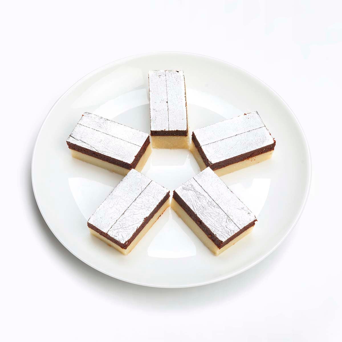 दूध के ठोस पदार्थ (खोया), चीनी, चांदी के पत्ते, (चॉकलेट, स्ट्राबेरी और आम)